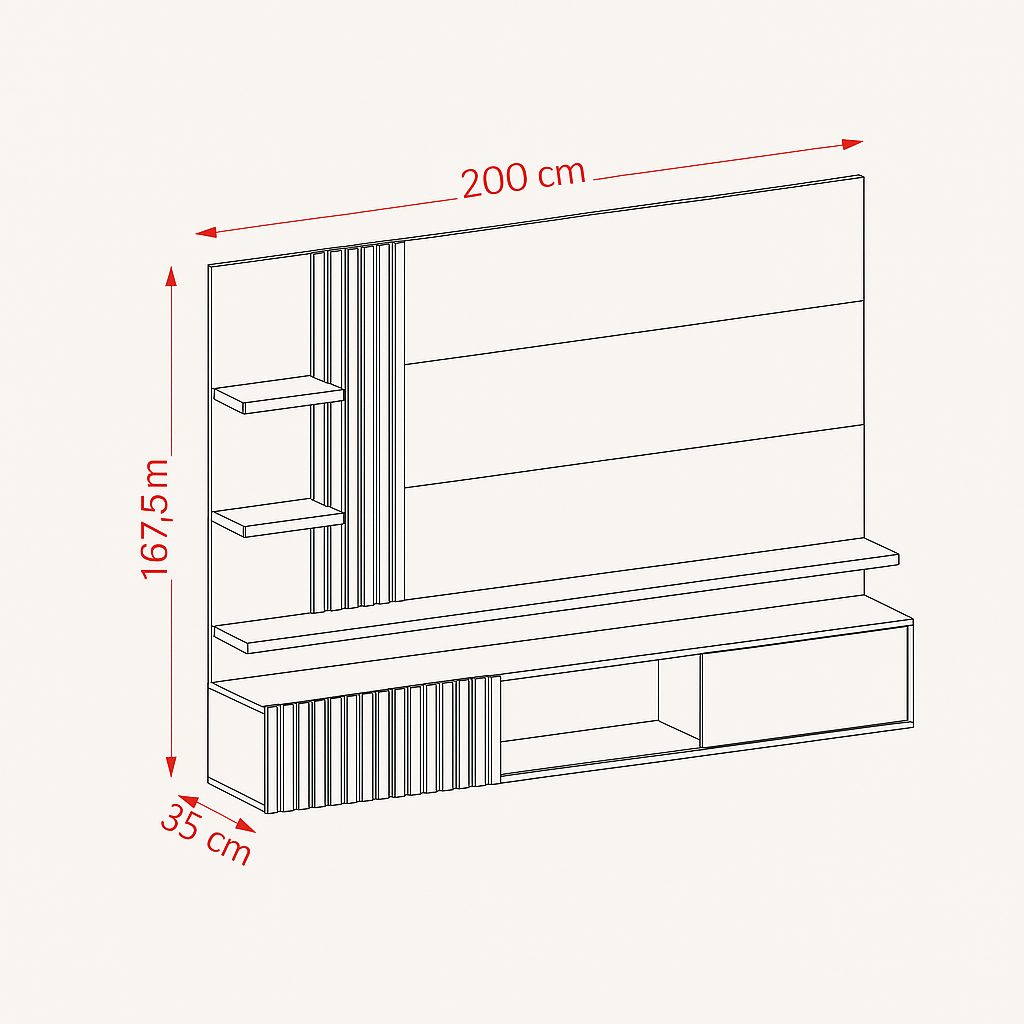 وحدة شاشة حديثة بتشطيب عالي الجودة ورفوف عرض وخزائن سفلية، تستوعب حتى 65 بوصة، مصنوعة من خشب كونتر طبيعي، بأبعاد 200×35×167.5 سم، تصميم أنيق وضمان 10 سنوات. السعر الأصلي هو: 5.500,00 EGP.3.400,00 EGPالسعر الحالي هو: 3.400,00 EGP.
