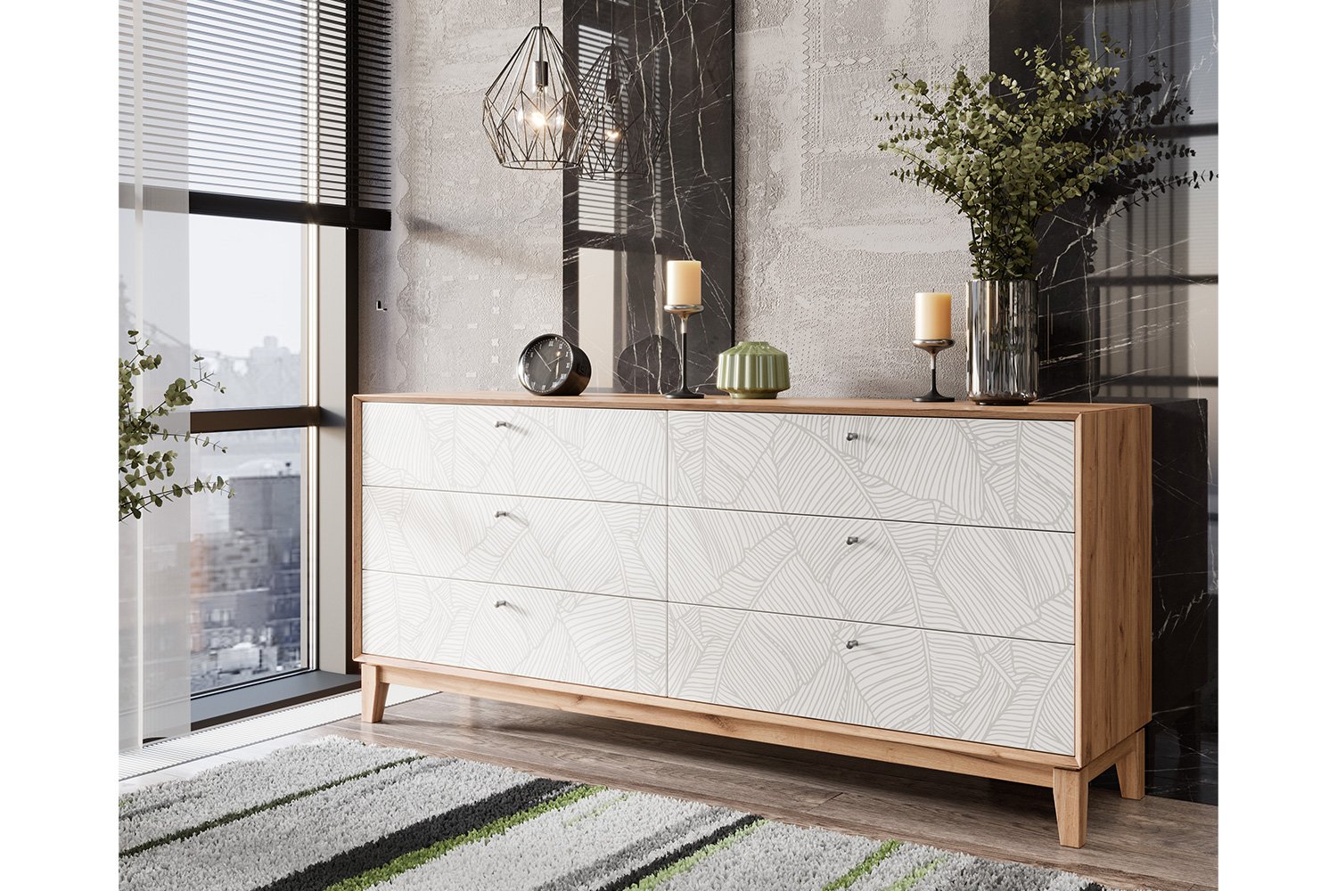 بوفيه Vento بتصميم عصري يجمع بين البساطة والعملية، مثالي لغرف المعيشة، المداخل، أو غرف النوم. يتكوّن من ستة أدراج أمامية بواجهة أنيقة، مزودة بمقابض مدمجة لسهولة الفتح، مع توزيع متوازن يضمن تنظيم مثالي. يرتكز على أرجل قصيرة من خشب زان طبيعي تضيف ثبات وأناقة، بينما الإطار الخارجي بتشطيب خشبي فاتح يضفي دفء على المساحة.