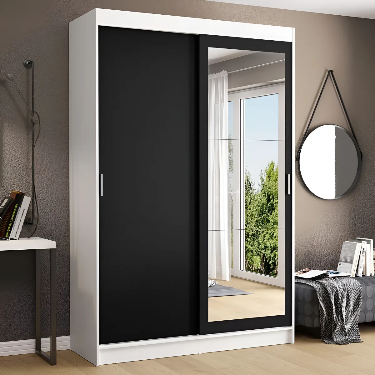 دولاب  عرض متر، عمق 60 سم، ارتفاع 210 سم، أبواب جرار، باب واحد بمرايا، خشب كونتر طبيعي وقوايم زان، تقسيمة داخلية عملية، ضمان 10 سنوات.