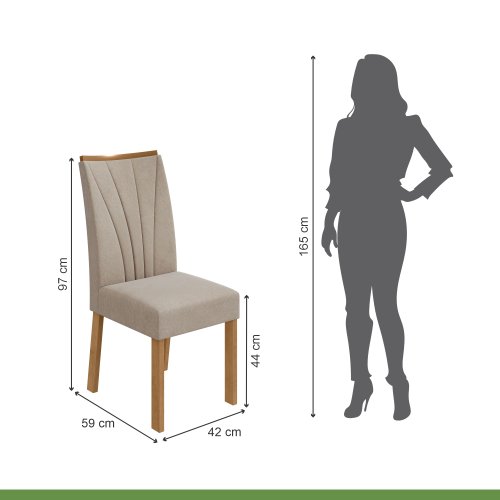 الكراسي بمقاس عرض 42 × عمق 59 × ارتفاع 97 سم، بهيكل من خشب الزان الأحمر، ومبطنة بقماش ووتر بروف مقاوم للماء والبقع، سهل التنظيف، ويوفر راحة مثالية للجلوس بفضل تصميمه المريح للظهر والمقعد. تتحمل وزن حتى 120 كجم.