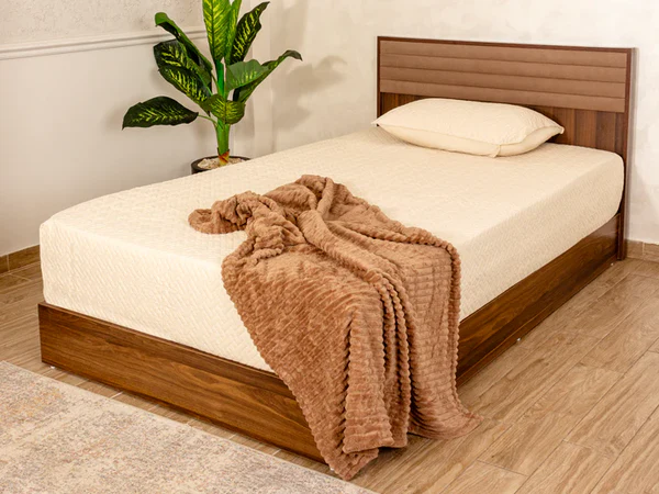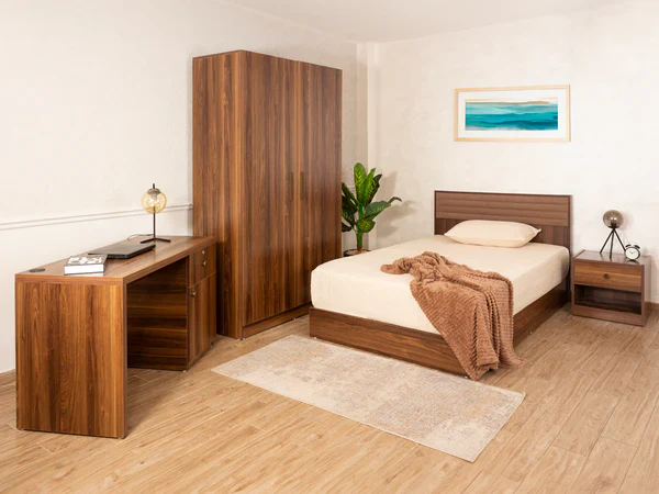 غرفة نوم متكاملة بتصميم عصري يجمع بين الراحة والتنظيم، مناسبة للاستخدام المنزلي أو الفندقي. تتكون من دولاب بابين مفصلي، سرير فردي، مكتب عملي، وكمود جانبي، مع أبعاد مدروسة لتوفير أقصى استفادة من المساحة.