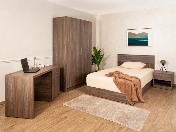غرفة نوم متكاملة بتصميم عصري يجمع بين الراحة والتنظيم، مناسبة للاستخدام المنزلي أو الفندقي. تتكون من سرير فردي، دولاب، مكتب، وكمود جانبي، مع أبعاد مدروسة لتوفير أقصى استفادة من المساحة.