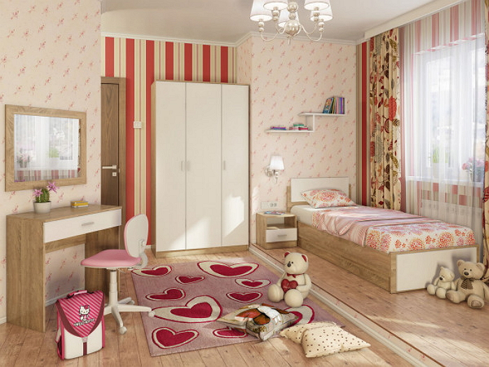 غرفة أطفال بتصميم عصري وديكور مرح، تجمع بين الوظيفة والراحة، مناسبة للمساحات الصغيرة أو الغرف الفندقية. تتكون من سرير مفرد، كمود، دولاب، وحدة أدراج، ومرآة، مع تفاصيل ديكورية غاية في الأناقة والبساطة.