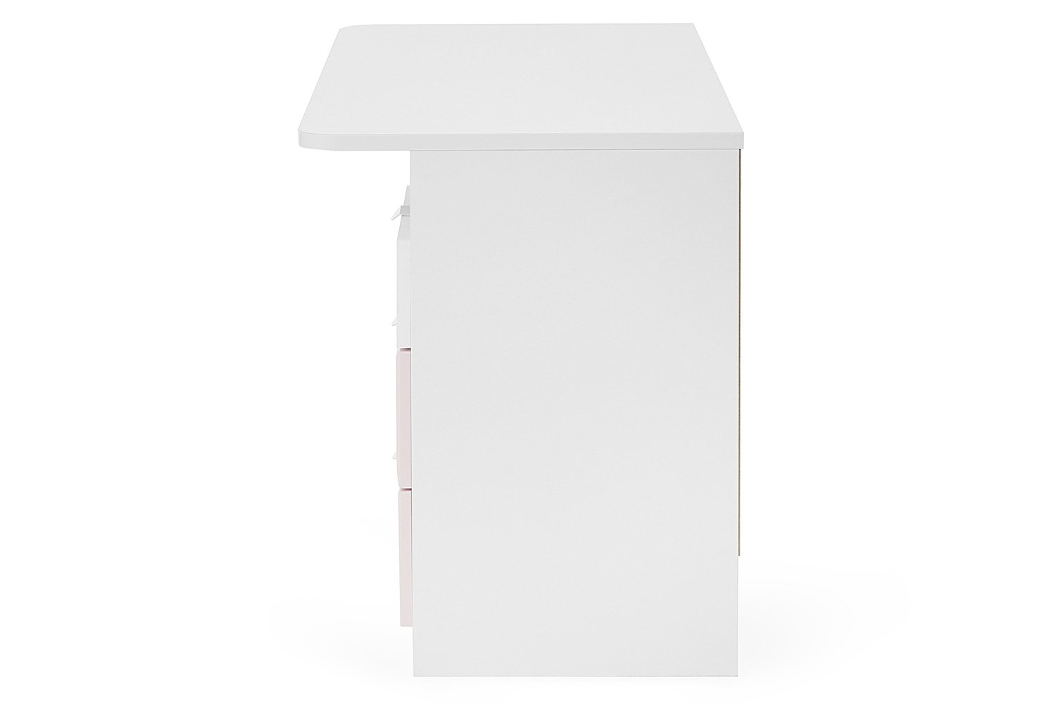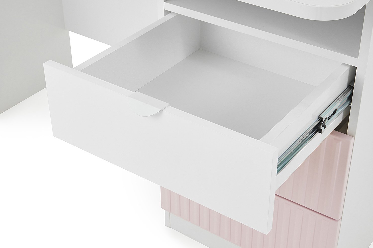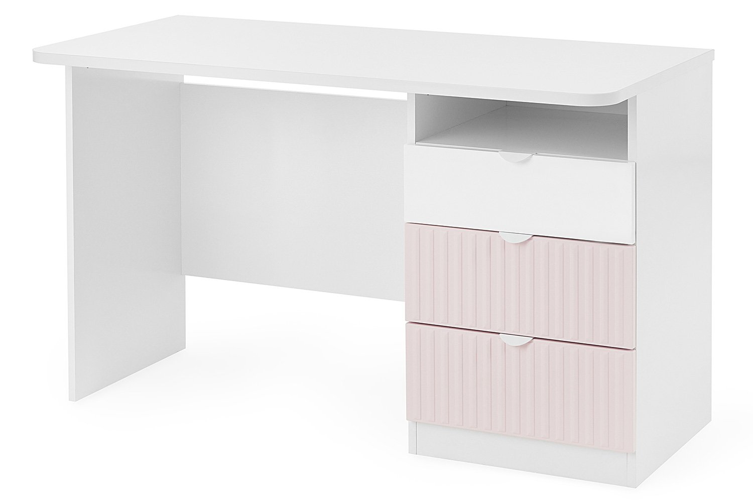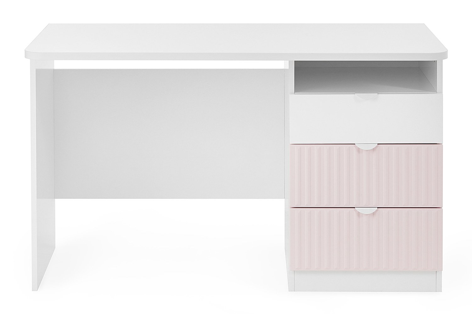 مكتب Carolina بتصميم أنيق يجمع بين البساطة واللمسة الأنثوية، مثالي لغرف البنات أو المساحات الهادئة. يتميّز بثلاثة أدراج جانبية، العلوي بلون أبيض ناعم، والسفليان بلون وردي بملمس مخطط يضفي طابعًا عصريًا. كما يحتوي على رف مفتوح عملي لتخزين الكتب أو الأدوات اليومية.