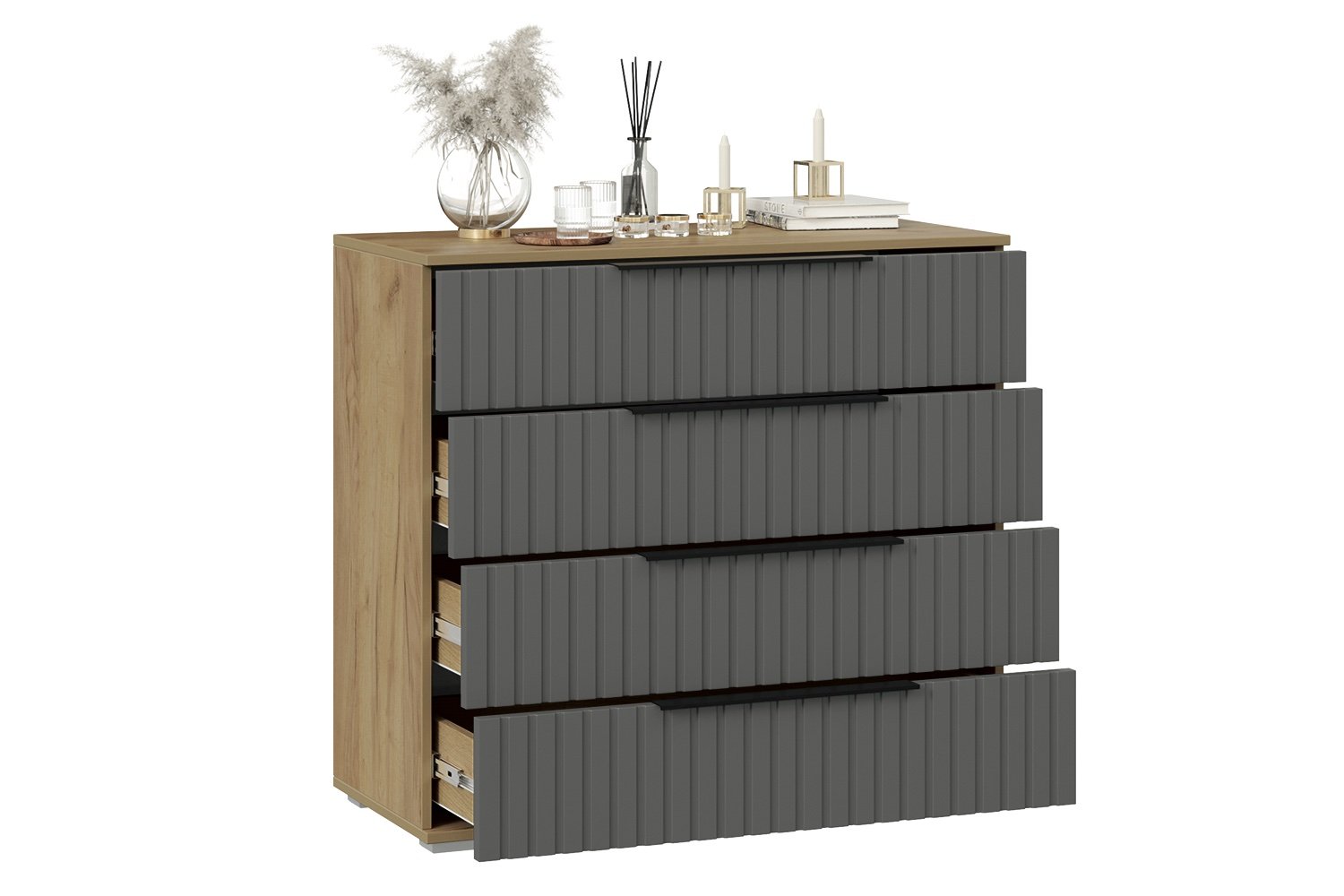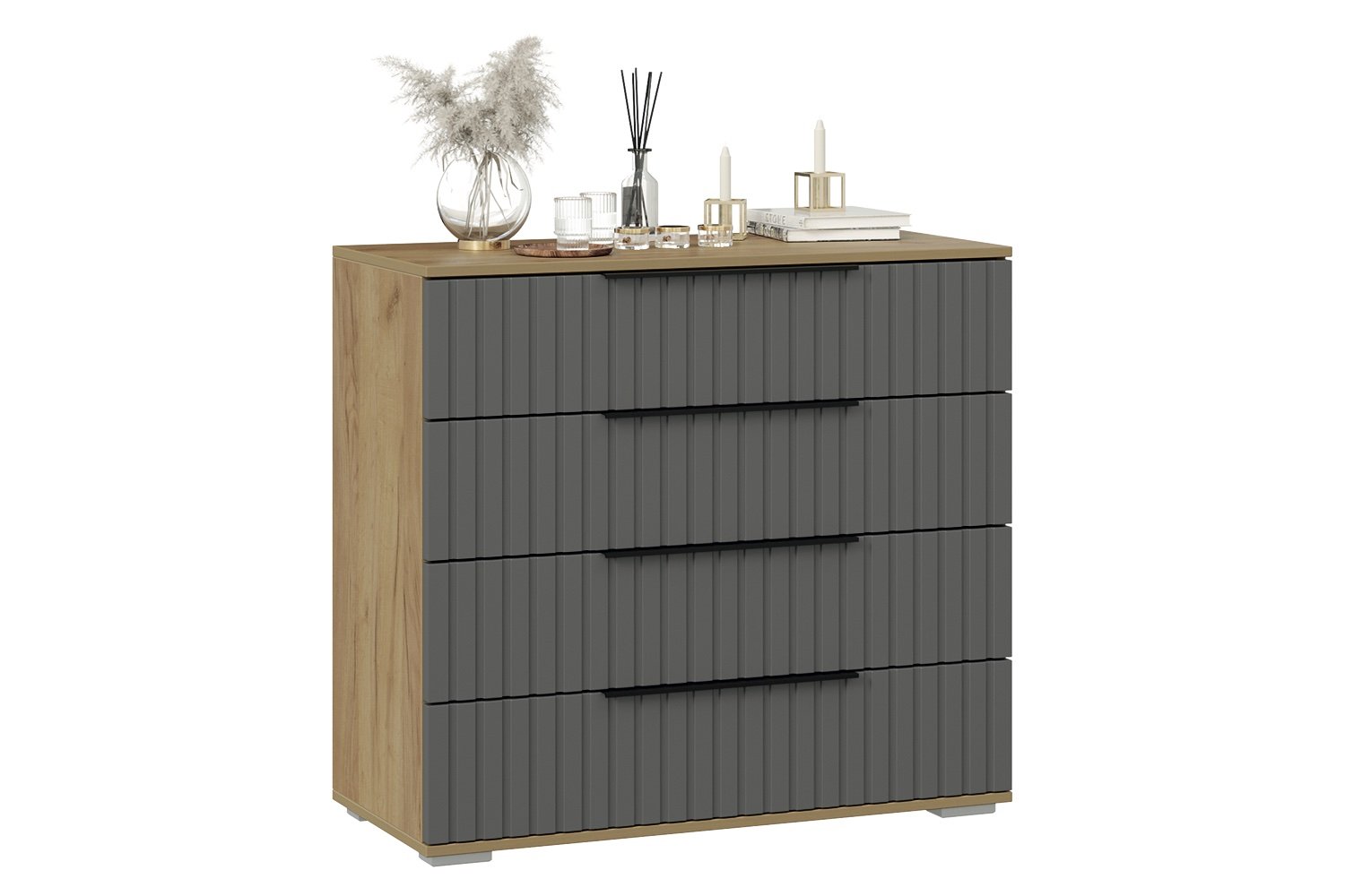 وحدة Ribbed مصممة لتوفير تخزين أنيق وعملي، مثالية لغرف النوم أو المكاتب. تتكوّن من أربعة أدراج أمامية بملمس مخطط رأسي يضفي طابع عصري مميز. كل درج مزوّد بمجر معدني قوي لضمان سحب سلس وثبات أثناء الاستخدام.