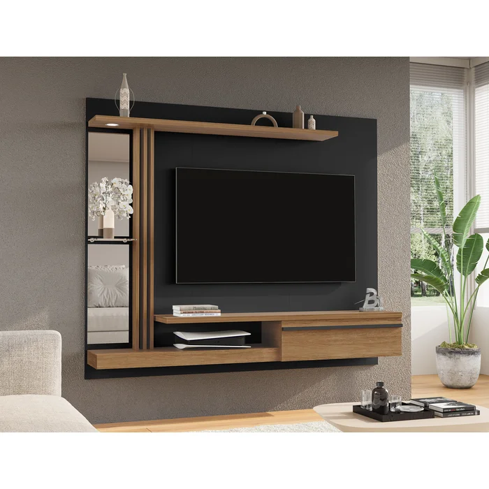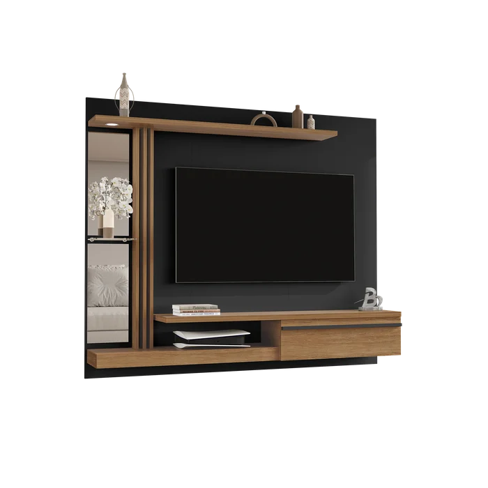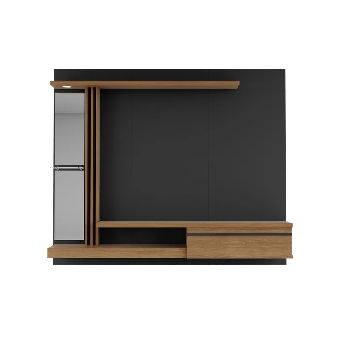 ترابيزة شاشة مصممة بأسلوب عصري أنيق، بخطوط بسيطة وتشطيب نظيف يناسب جميع المساحات. الخلفية تتكوّن من لوح خشبي باللون الأسود الهادئ، يتوسطه مساحة مخصصة لتعليق الشاشة بشكل مركزي بمقاسات مثالية. الهيكل يحتوي على رفوف جانبية وعناصر تخزينية بتوزيع عملي، مما يمنحك حل متكامل للعرض والتنظيم.