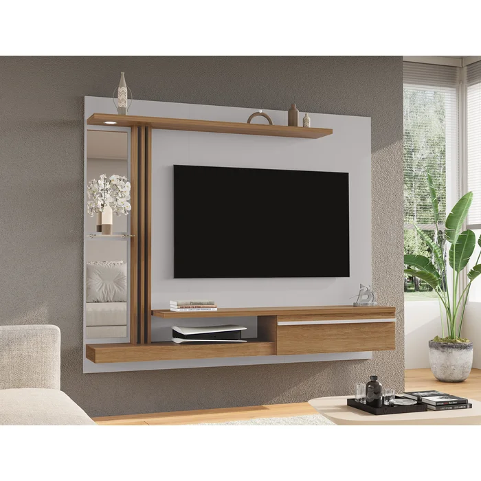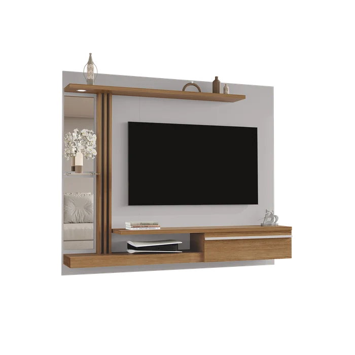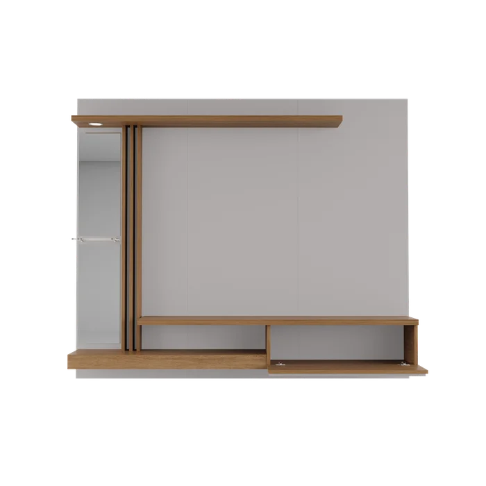 ترابيزة شاشة مصممة بأسلوب عصري أنيق، بخطوط بسيطة وتشطيب نظيف يناسب جميع المساحات. الخلفية تتكوّن من لوح خشبي باللون الأسود الهادئ، يتوسطه مساحة مخصصة لتعليق الشاشة بشكل مركزي بمقاسات مثالية. الهيكل يحتوي على رفوف جانبية وعناصر تخزينية بتوزيع عملي، مما يمنحك حل متكامل للعرض والتنظيم.