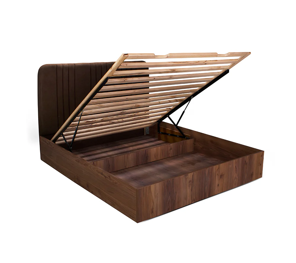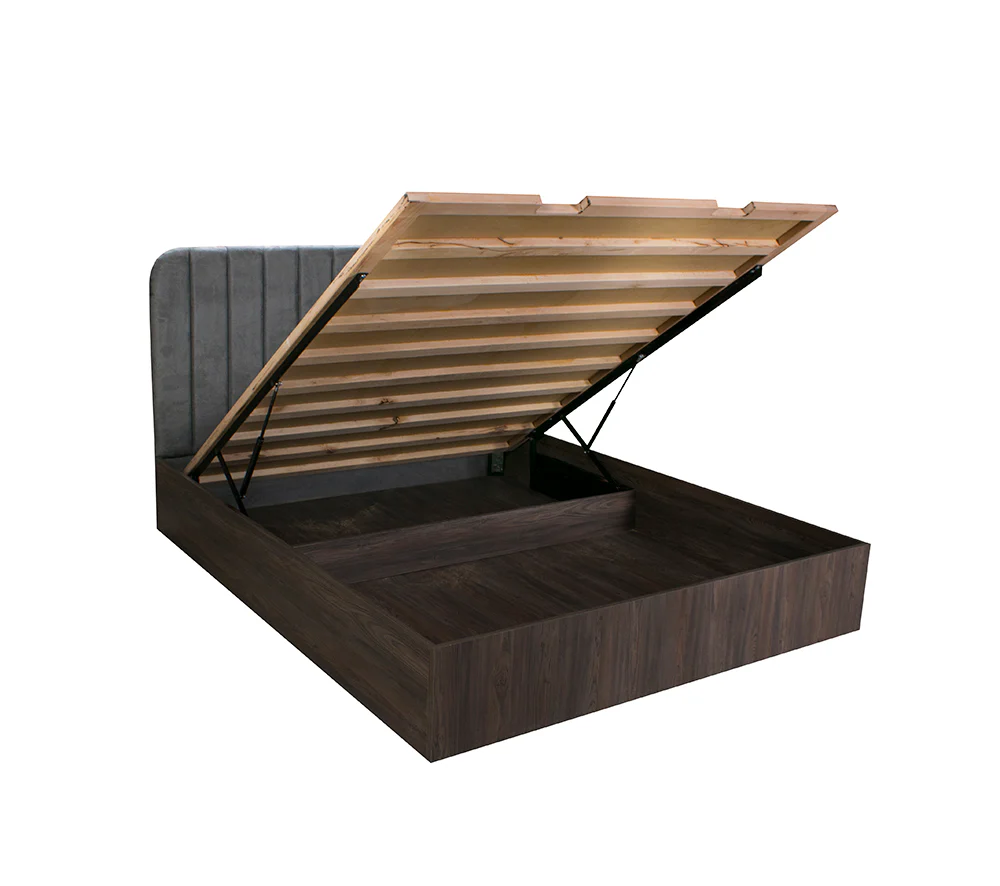 غرفة نوم متكاملة – سرير 160×200 سم بميكانيزم تخزين، دولاب 240×210 سم عمق 60 سم، تسريحة بمرايا 100 سم، 2 كمود 52 سم، تصميم عملي وخامات عالية الجودة، بضمان 10 سنوات.