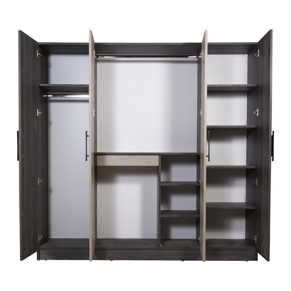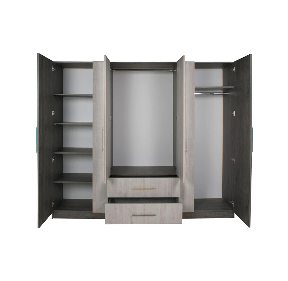 غرفة نوم متكاملة – دولاب 4 أبواب 180 سم (قسم تعليق + قسم رفوف)، سرير 160×200 سم، كمود 40 سم، وحدة أدراج 90 سم، مرآة 85 سم، تصميم عملي وخشب كونتر طبيعي، بضمان 10 سنوات.