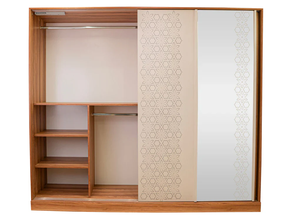 غرفة نوم متكاملة – دولاب بابين جرار 240 سم، سرير 160سم، تسريحة بمرايا 120 سم، 2 كمود 50 سم، تصميم عملي وخامات عالية الجودة، بضمان 10 سنوات.