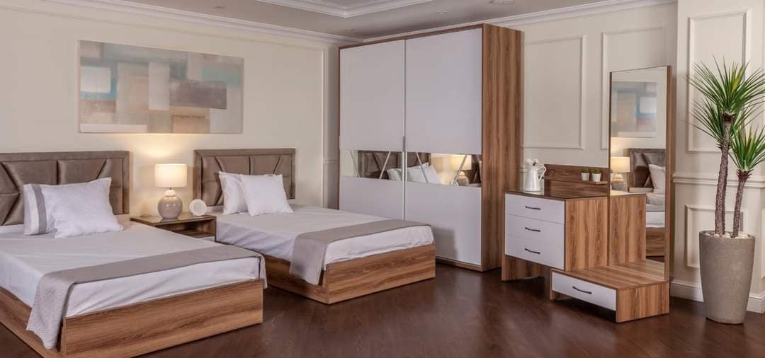 غرفة نوم متكاملة – دولاب بابين سحاب 200 سم، 2 سرير 120سم، كمود 60 سم، تسريحة 120 سم، تصميم عملي وخامات عالية الجودة، بضمان 10 سنوات.