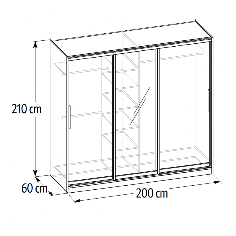 دولاب Lecco ثلاث ضلف بأبواب جرّار + وحدة تخزين علوية – تقسيمة عملية تشمل تعليق مزدوج ورفوف مفتوحة – مقاس 200×60×210 سم – خشب كونتر طبيعي – بضمان 10 سنوات.